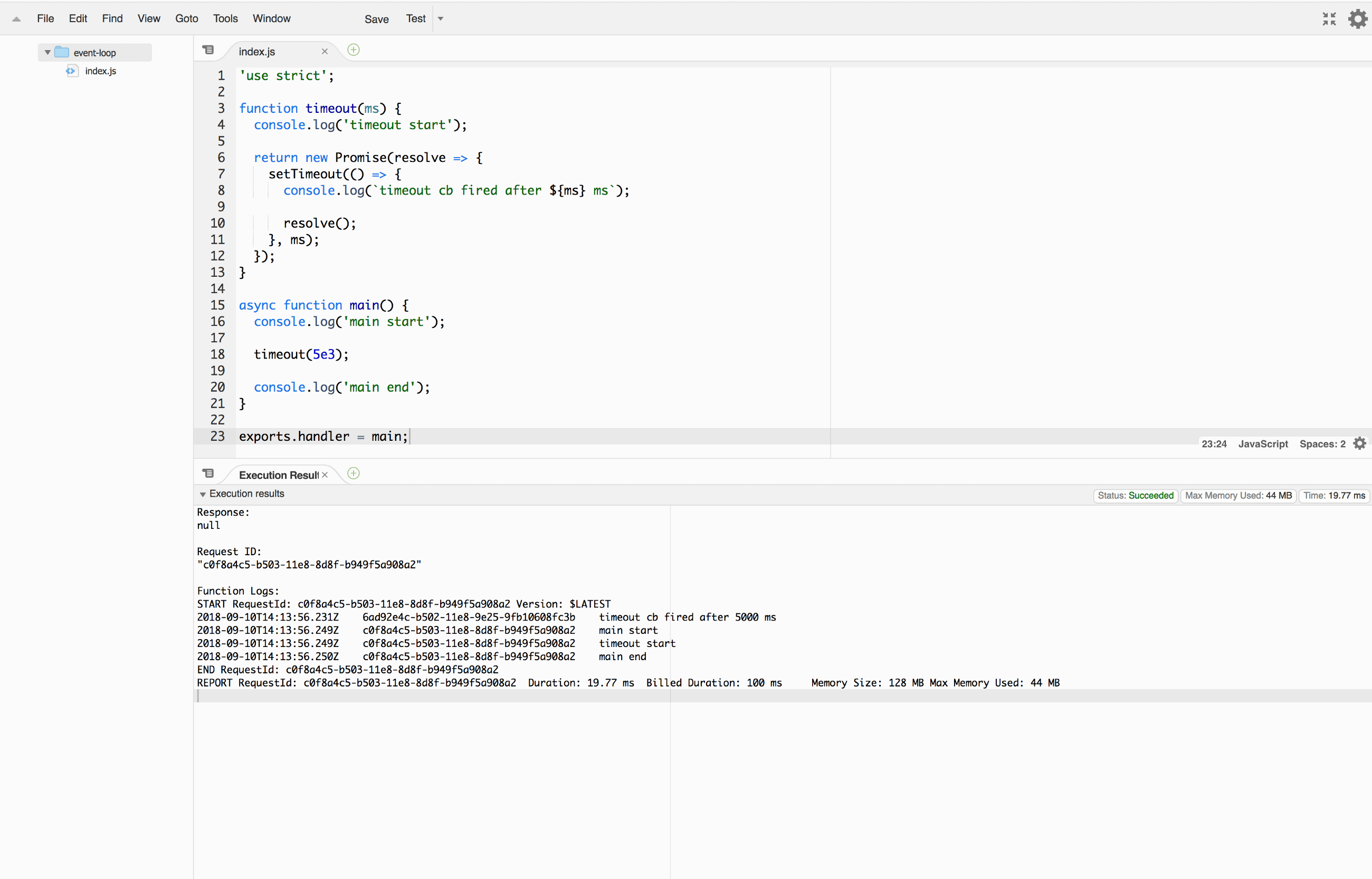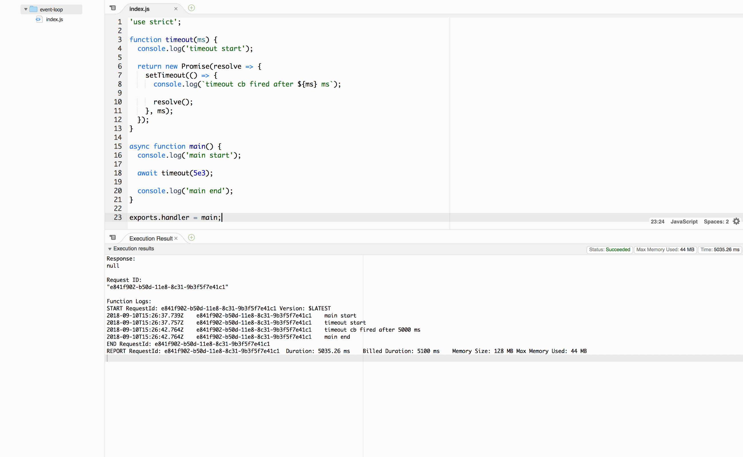 Wait, what? Lambda just ended the handler function without printing the last message timeout cb fired after 5000 ms. Lets run it again.