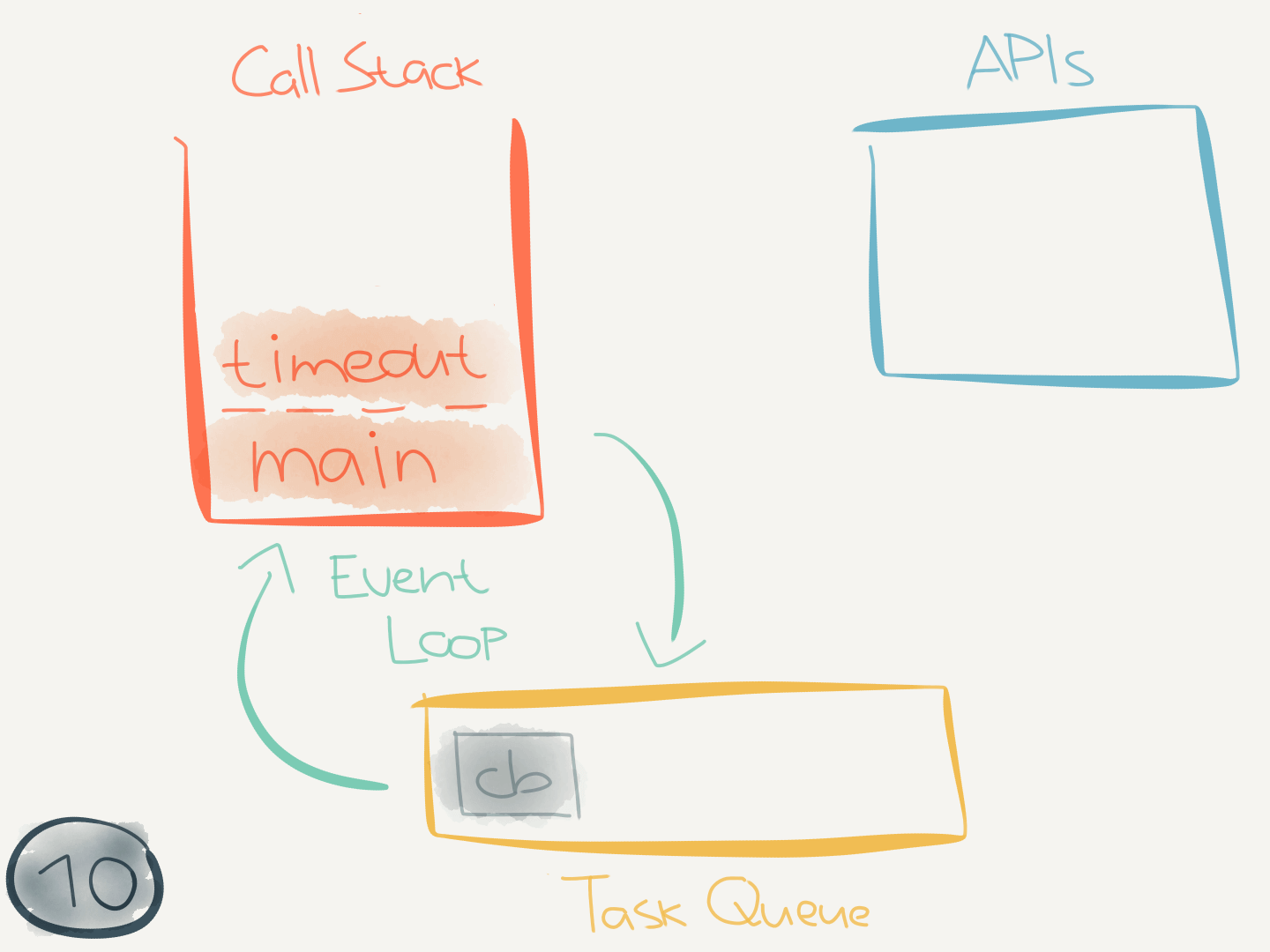 Okay, so with this information we can make sense of what happened when we executed the code in timeout.js before. Lets break it down and go over it step by step.