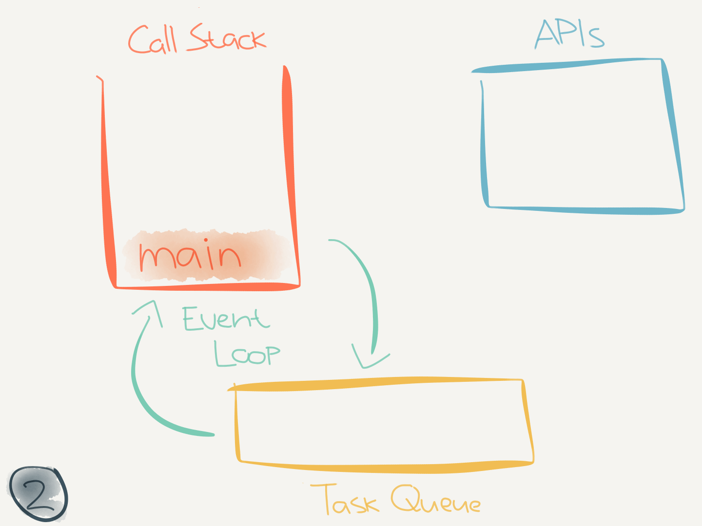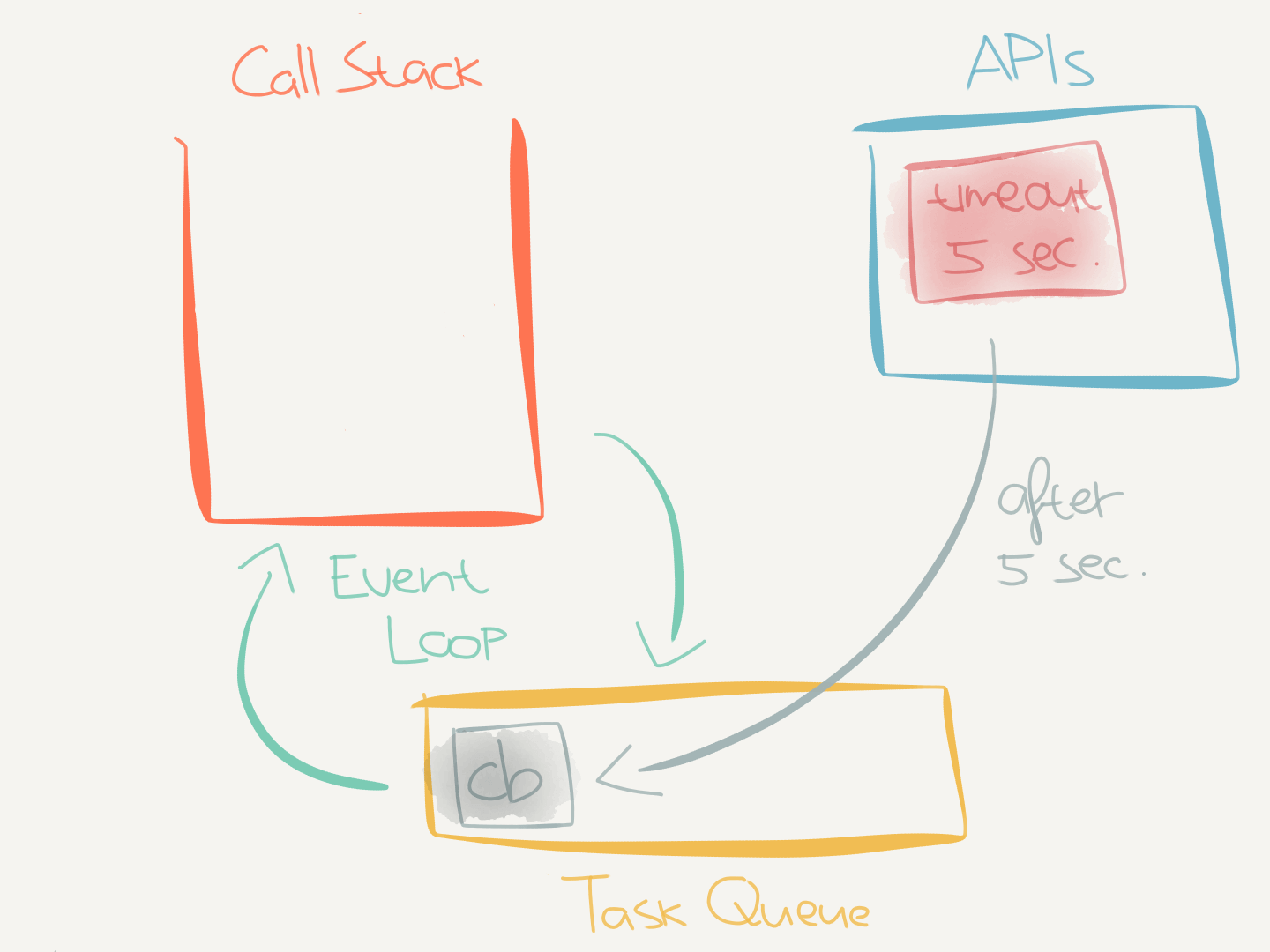 This code didn’t interact with any asynchronous (internal) APIs. But when it does (like when calling setTimeout(callback)) it makes use of the task queue.